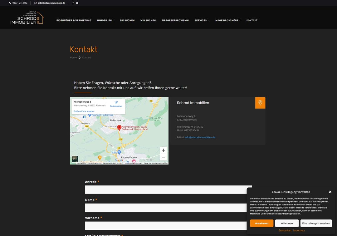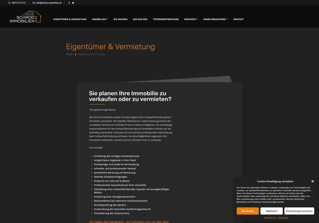 Die Webseite www.schrod-immobilien.de dient als repräsentatives Aushängeschild eines erfahrenen Immobilienmaklers. Diese Webseite repräsentiert nicht nur visuell, sondern auch funktional.
